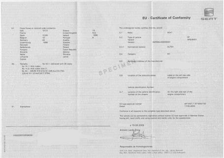Notre société COC AUTO délivre le certificat de conformité officiel et authentique. Le COC est délivré par le service homologation Seat. Le certificat de conformité Seat est un document authentique et original édité par le constructeur Seat Europe. Ce document COC permet d'immatriculer un véhicule étranger.